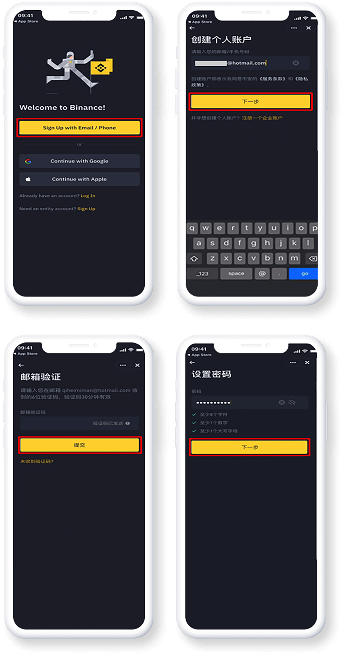 ①打开“币安APP” 点击“Sign UP With Email/Phone”(使用邮箱或是手机 号进行注册);