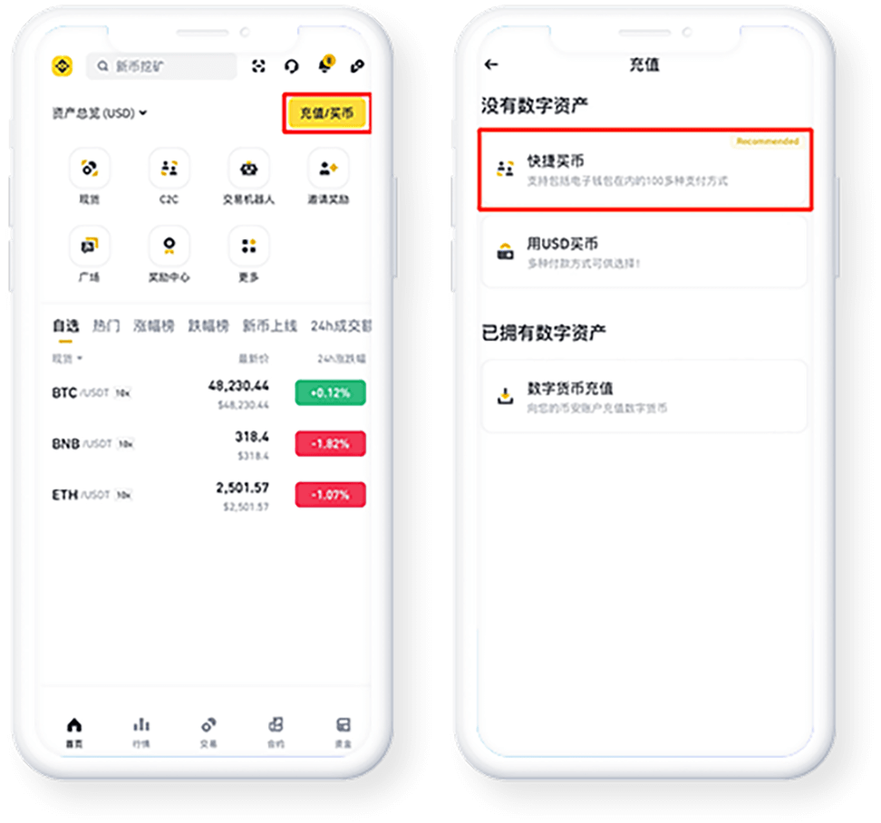 1. 打开“币安APP” 首页上方 “充值/买币”
