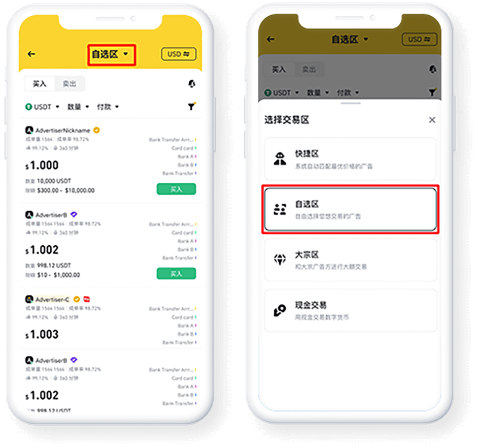 2.选择快捷买币 → 在上方可以选择交易模式,此操作为“自选区”