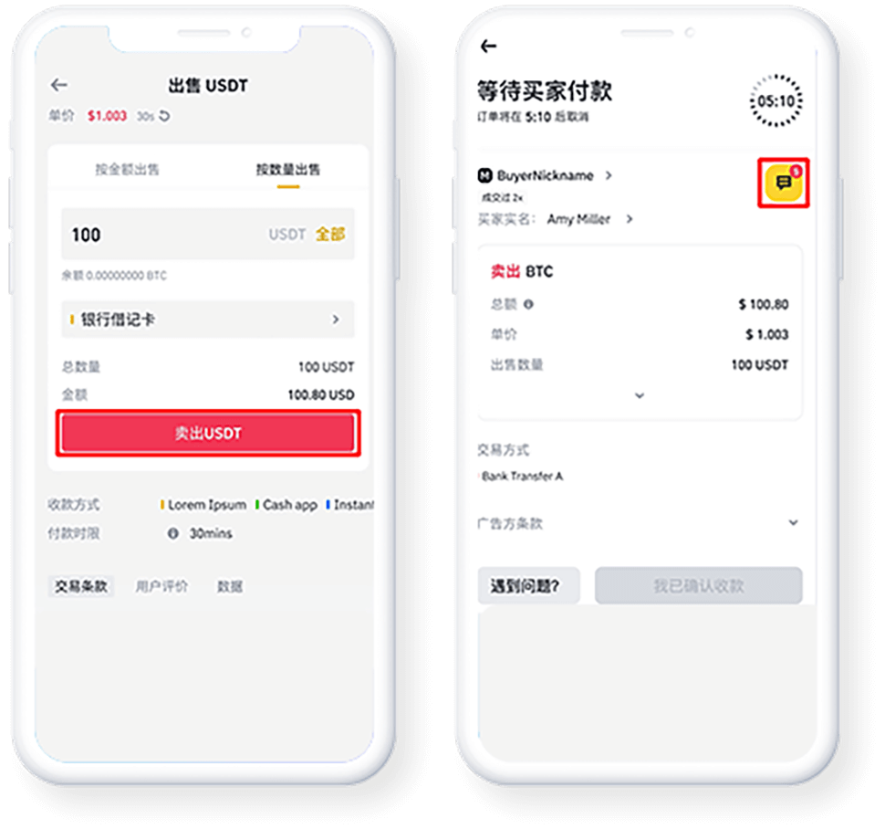 点击【卖出USDT】,等待买家付款,待确认收款点亮后即