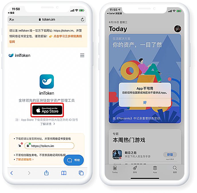 ③ 如果点击「App Store」后,页面提示「App 不可用」, 说明imToken在你的Apple ID 所在国家或地区上架。