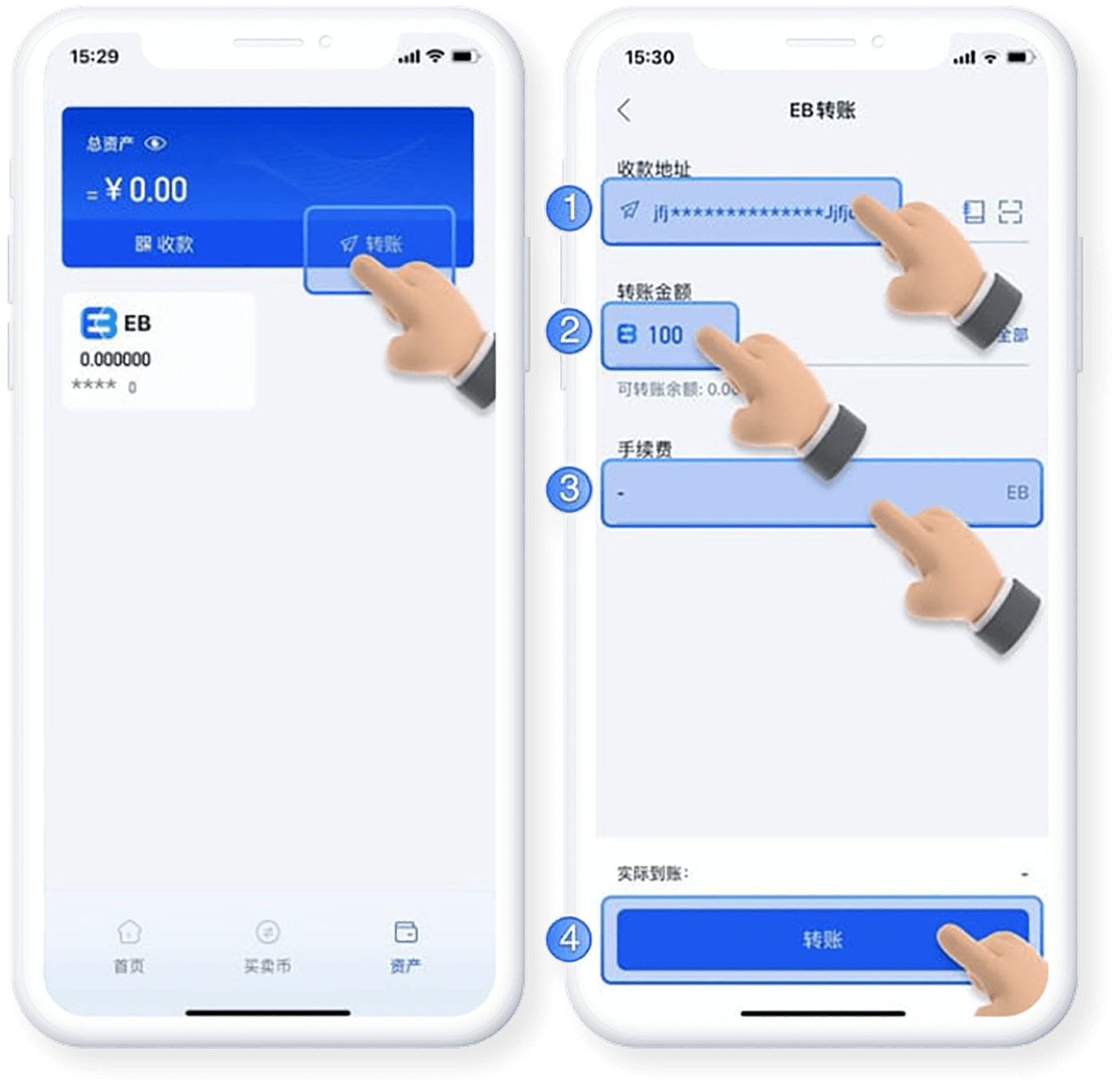 选择对应的【链名称】,粘贴EB地址,输入转账金额与手续费, 点击【转账】